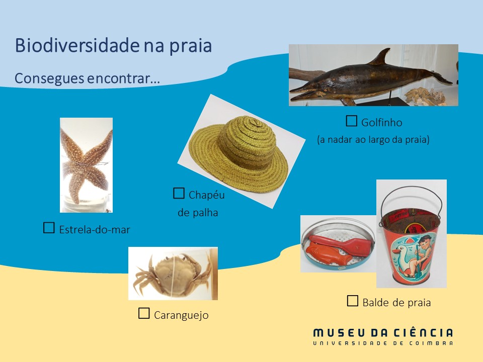 Uma estrela-do-mar, um golfinho a nadar, um caranguejo… e um chapéu de palha e um balde.Quais consegues encontrar?