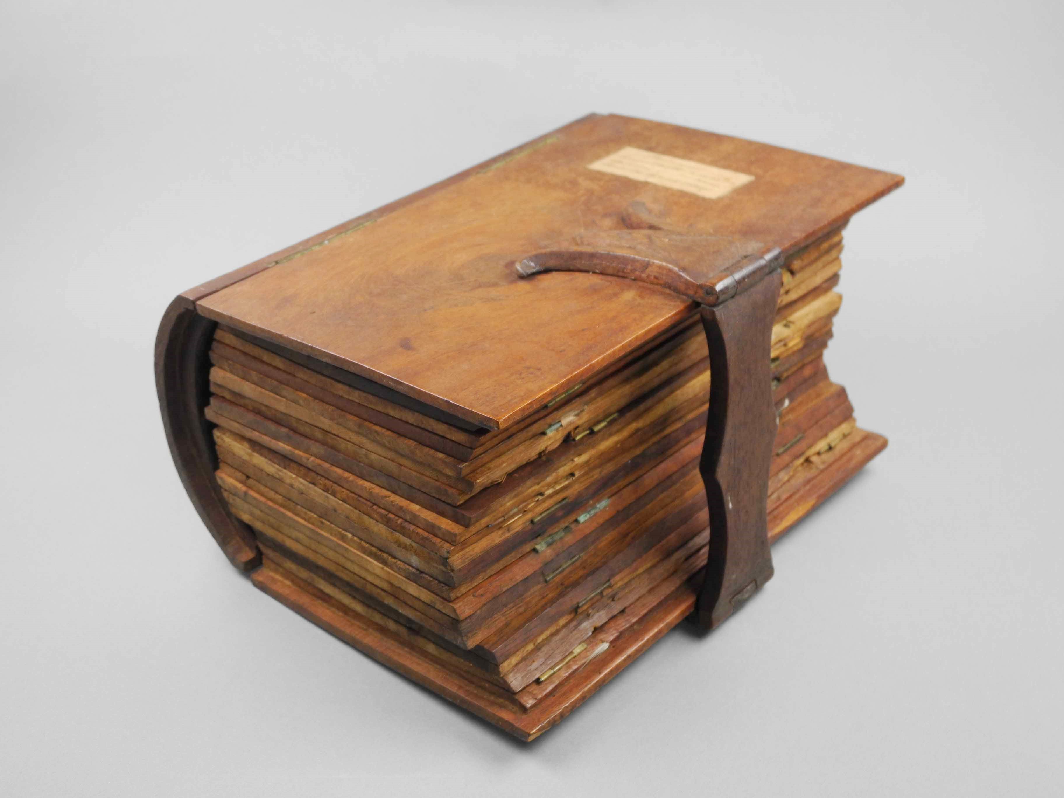 O livro desdobra-se em 18 amostras de diferentes madeiras, pequenas peças retangulares com dimensões (14(largura)x22,5(comprimento)x0,5(altura) cm), todas iguais, numeradas e etiquetadas, articuladas entre si.