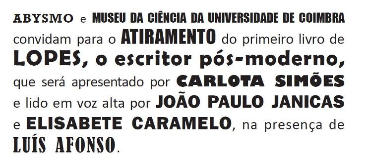 João Paulo Janicas e Elisabete Caramelo irão ler excertos deste livro, apresentado por Carlota Simões. A sessão conta ainda com a presença de Luís Afonso.