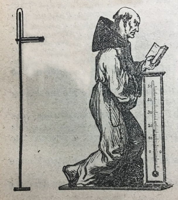 Sabemos que a água está constantemente a evaporar-se da superfície dos mares, rios, etc.; por isso a atmosfera contém sempre uma quantidade de vapor de água, em proporções que variam de dia para dia, dependendo de várias circunstâncias como a temperatura do ar ou a velocidade do vento. Sabemos também que certas substâncias orgânicas, tais como os cabelos, sofrem variações de volume muito sensíveis, sob a influência da humidade, sobretudo se os cabelos se encontrarem torcidos, formando uma corda. Esta propriedade tem sido aplicada na construção de instrumentos muito simples com os quais é possível prever o estado geral da humidade do ar. Neste caso, temos uma figura de um monge que possui um braço móvel, onde é fixa uma corda feita com cabelos. Quando há mais humidade no ar, o braço direto do monge eleva-se e a cruz indica a probabilidade de “Chuva”. Quando o ar está mais seco, a cruz indica a probabilidade de “Bom tempo”. A posição intermédia indica tempo “Variável”.