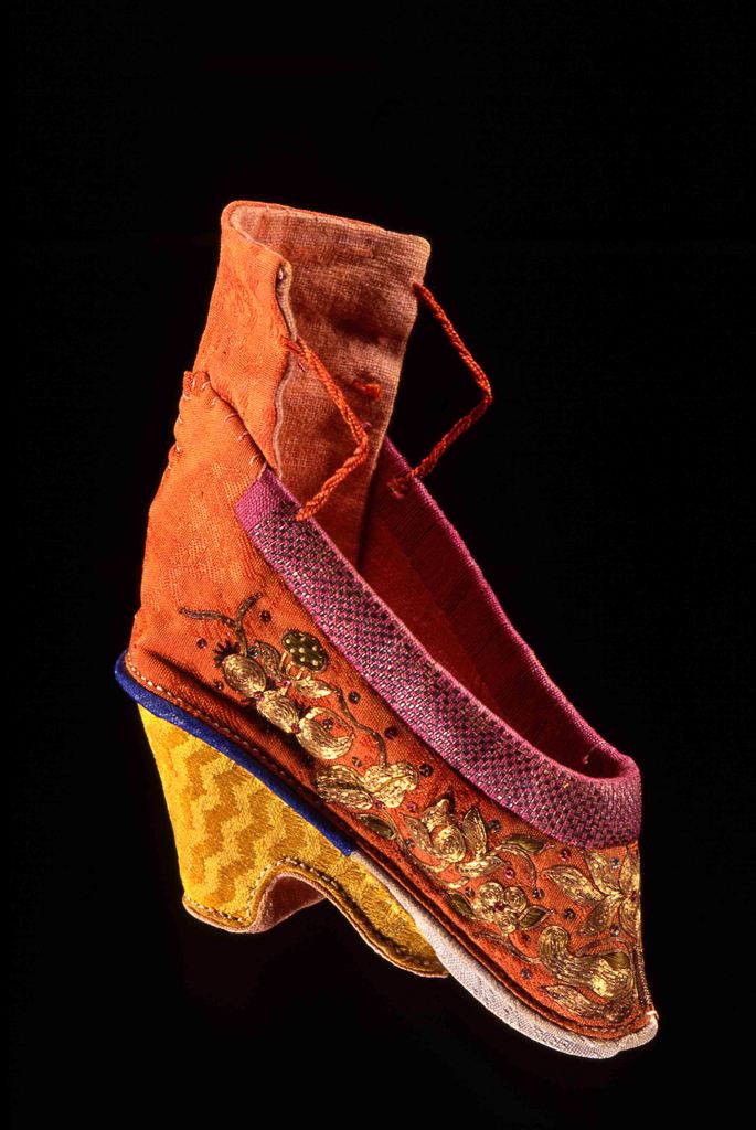 Deste conjunto faz parte este exemplar que hoje apresentamos, um sapato de lótus. Com a ajuda de uma faixa, procedia-se à compressão do pé que forçava os ossos dos tarsos, metatarsos e falanges dos pés para a região plantar, provocando deformações ósseas irreversíveis. Desde os primeiros anos de vida, as mulheres que pretendessem ascender socialmente eram submetidas a esta prática, que impedia o normal crescimento dos pés, sendo que, na fase adulta, não deveriam ultrapassar os 8 cm de comprimento.