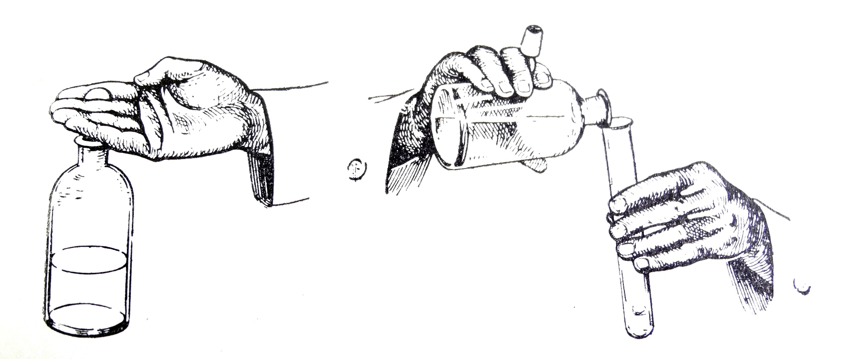 A melhor maneira de nos servirmos de um frasco que contém um reagente líquido é proceder como indicado na figura: com a mão direita retirar a rolha e pegar no frasco, ficando a mão esquerda livre para segurar no tubo de ensaio.