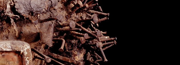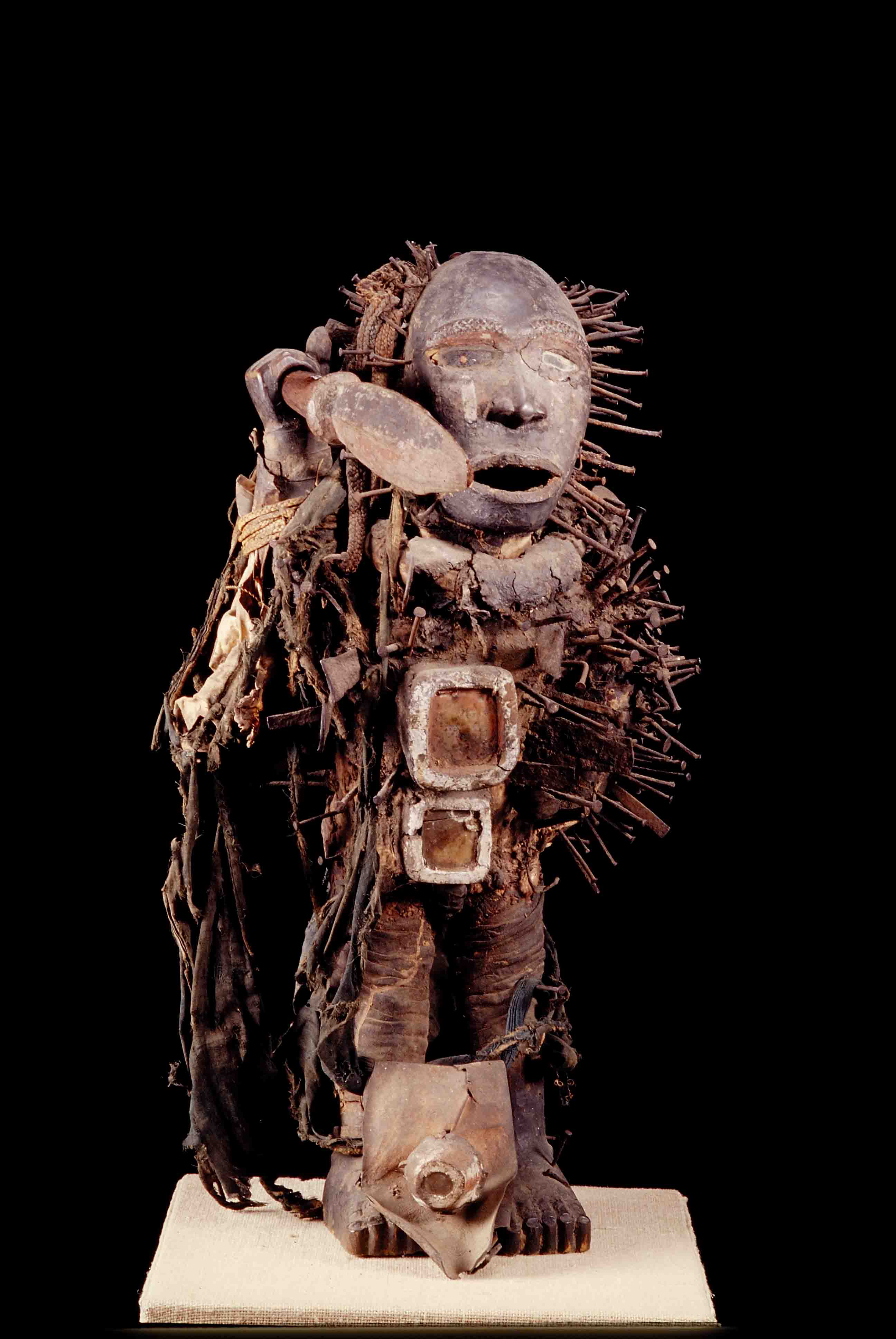 À guarda e usados pelo Nganga, intermediário que comunica com o mundo espiritual, exemplares como este Nkisi Nkondi, pertencente aos Yombe (Cabinda) e doado à Universidade de Coimbra em 1916 por José Pinto Meira, destinam-se à proteção coletiva, com funções terapêuticas ou fortificantes, previnem ou curam doenças, punem falsos juramentos, detetam infratores, protegem o repouso dos defuntos, zelam pelos costumes tradicionais ou presidem a interesses da aldeia conquistando graças e favores. Revelam a presença de cargas mágicas ou de espelhos cuja função é perscrutar o além ou outros mundos, refletindo as aparências.