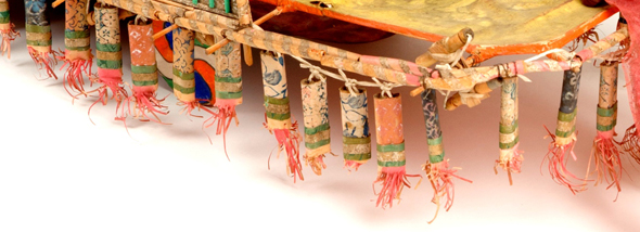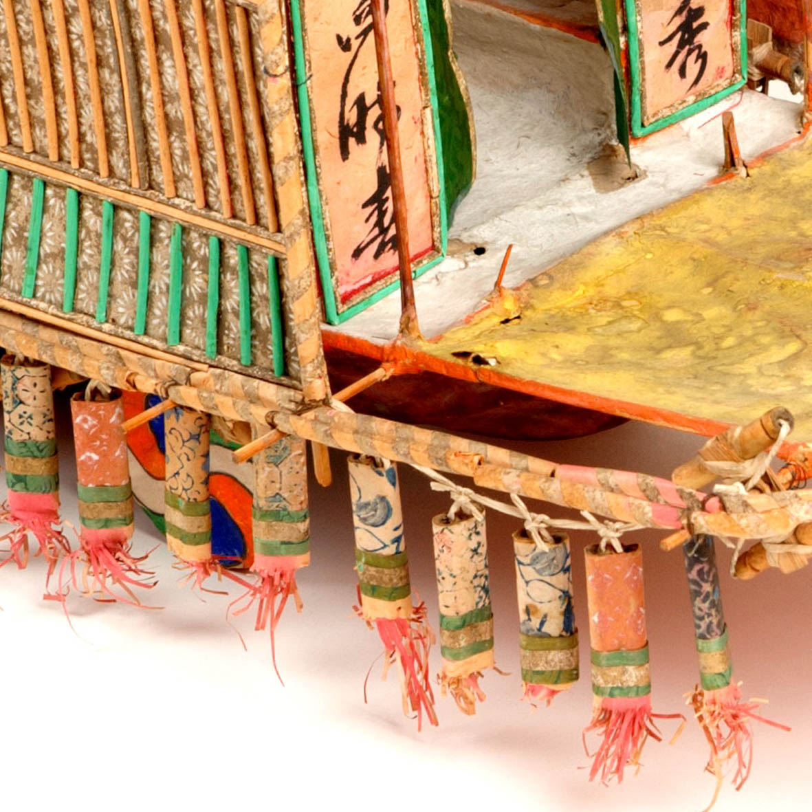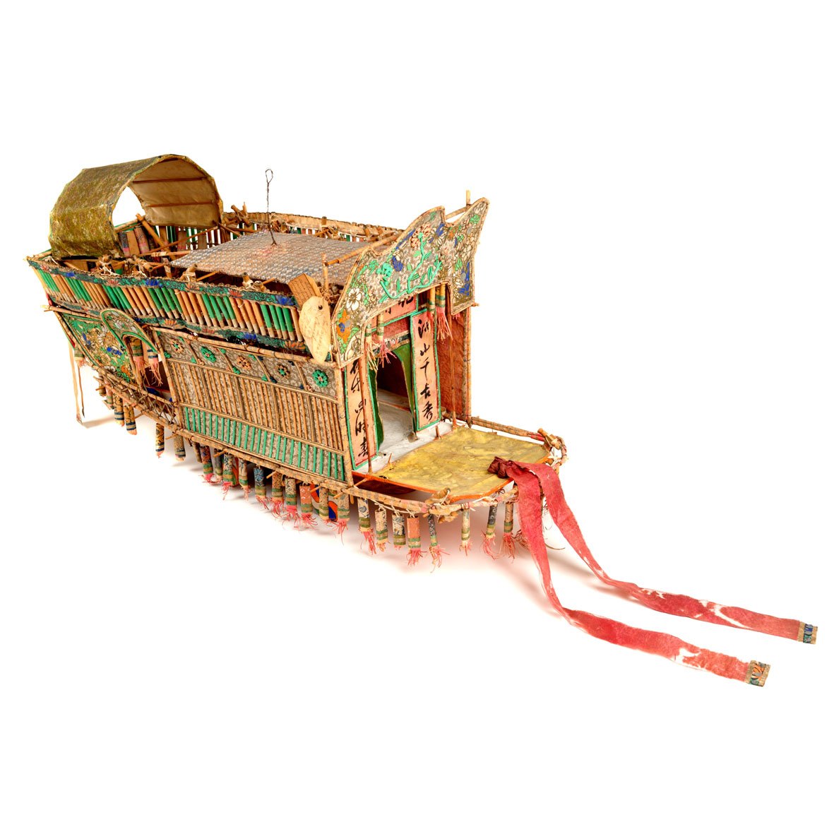 Esta peça, coletada por José Alberto Corte Real, em 1882, em Macau, é uma reprodução tridimensional de uma embarcação de cariz ritual, queimada por fogo de artifício em cerimónias fúnebres. Apresenta-se profusamente revestida com papéis coloridos xilogravados, papelão, panchões, caracteres chineses gravados.